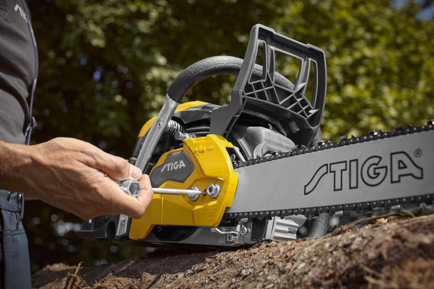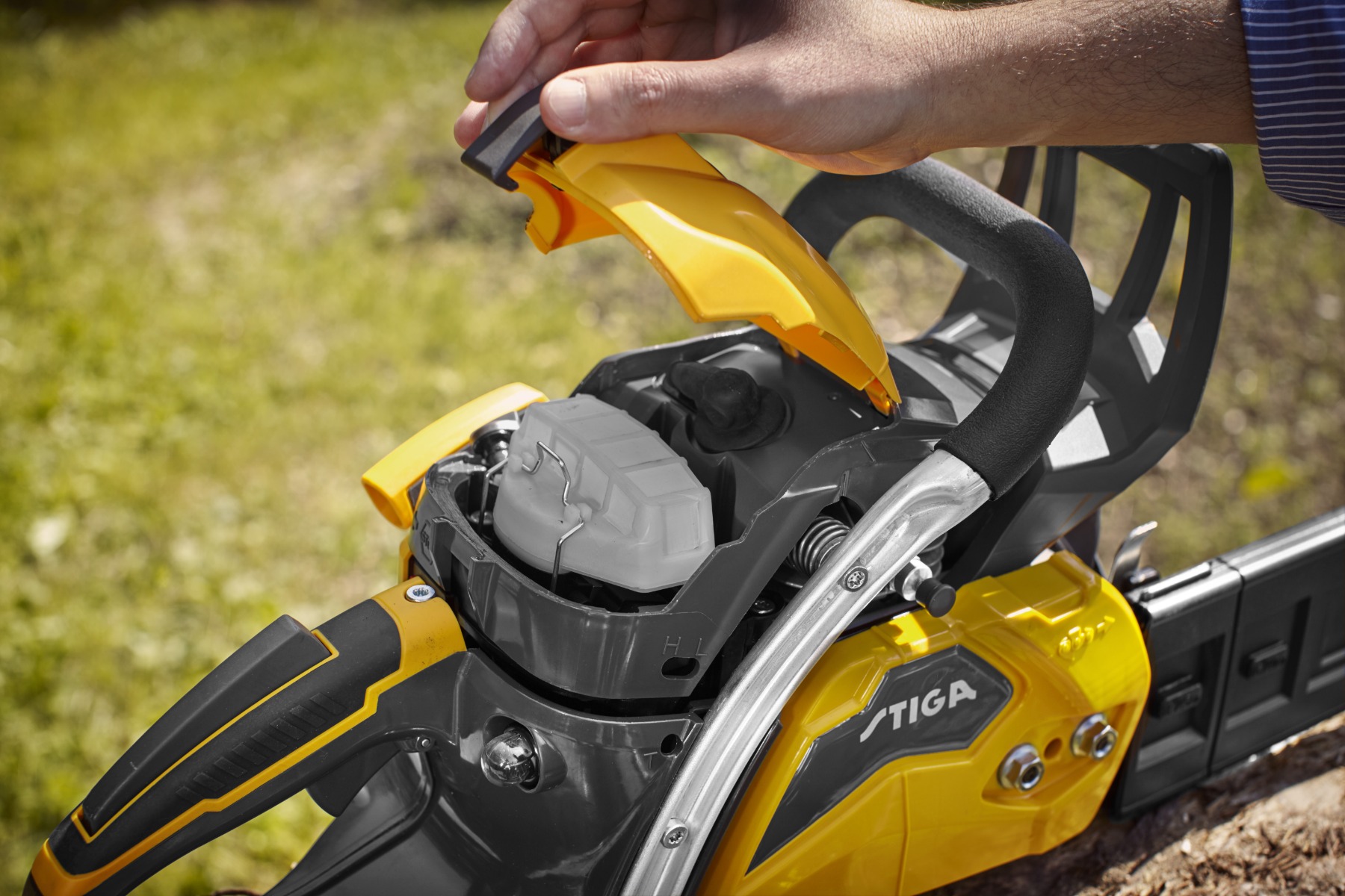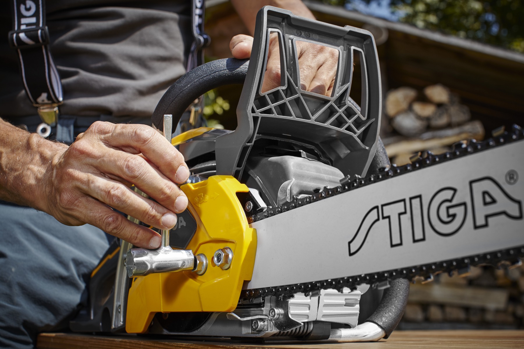 The reliable STIGA CS 755 (15″)petrol chainsaw has a good weight-power ratio, with a 45 cm (18″) guide bar making it suitable for both domestic and forestry work. The 52 cc (2.5 kW) petrol engine is teamed with a magnesium engine cover which ensures robustness, reliability and quick cooling. The decompression valve allows easy starting, while the oil pump is automatic and adjustable. Maintenance operations can be performed quickly and easily thanks to a number of features; such as the tool-less handle on the air filter cover without the need for additional tools, the tensioning wrench located under the rear handle and the fuel tank level monitoring window. The ergonomic soft-touch handle and spring system ensure reduced vibrations and greater comfort.